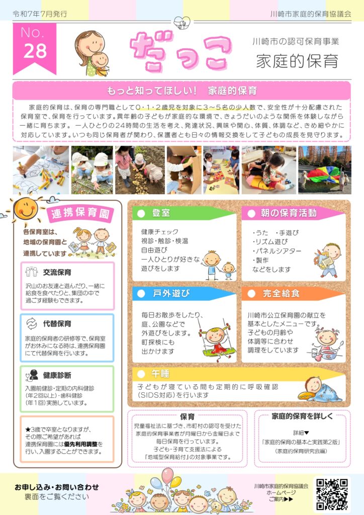 川崎市家庭的保育協議会が発行する、家庭的保育を紹介する機関誌「だっこ」のご案内です。