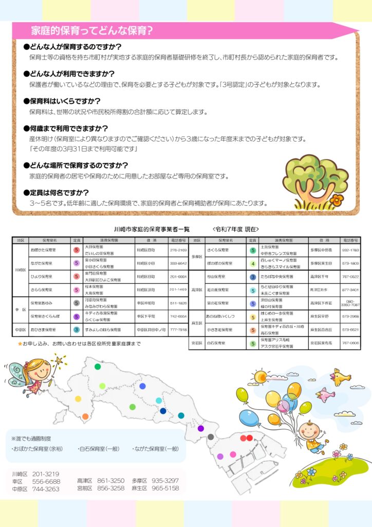 家庭的保育とはどのような保育なのかがわかりやすくまとめてあるほか、川崎市内の家庭的保育施設のご案内も記載されていますので、お近くの家庭的保育室の見学の際などにご活用ください。